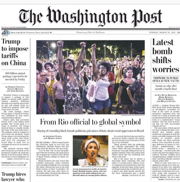 Tem matado muitos. Crimes políticos sem a menor dúvida. Marielle está acompanhada por muitas outras vítimas, mas desta vez foi a gota de água. Nas redes sociais há várias hashtags com o seu nome mas falam muito mais do que nela. É ler o que se diz em    #MariellePresente